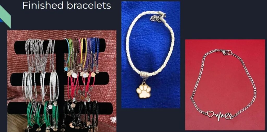 The first items that I sold were bracelets. These included many different colored braided bracelets and a chain link heartbeat bracelet. I wanted to make these bracelets affordable by anyone, including my classmates, so they sell for only $2 each. All of my profits go directly to the Associate Humane Society of Tinton Falls. I advertised my bracelets through my mom’s Facebook account, word of mouth, showing friends the bracelets I was wearing, and by having signs on the tables at my popup events. At these events, customers suggested other types of items that might be great additions to my bracelets. I kept these in mind for the future.
