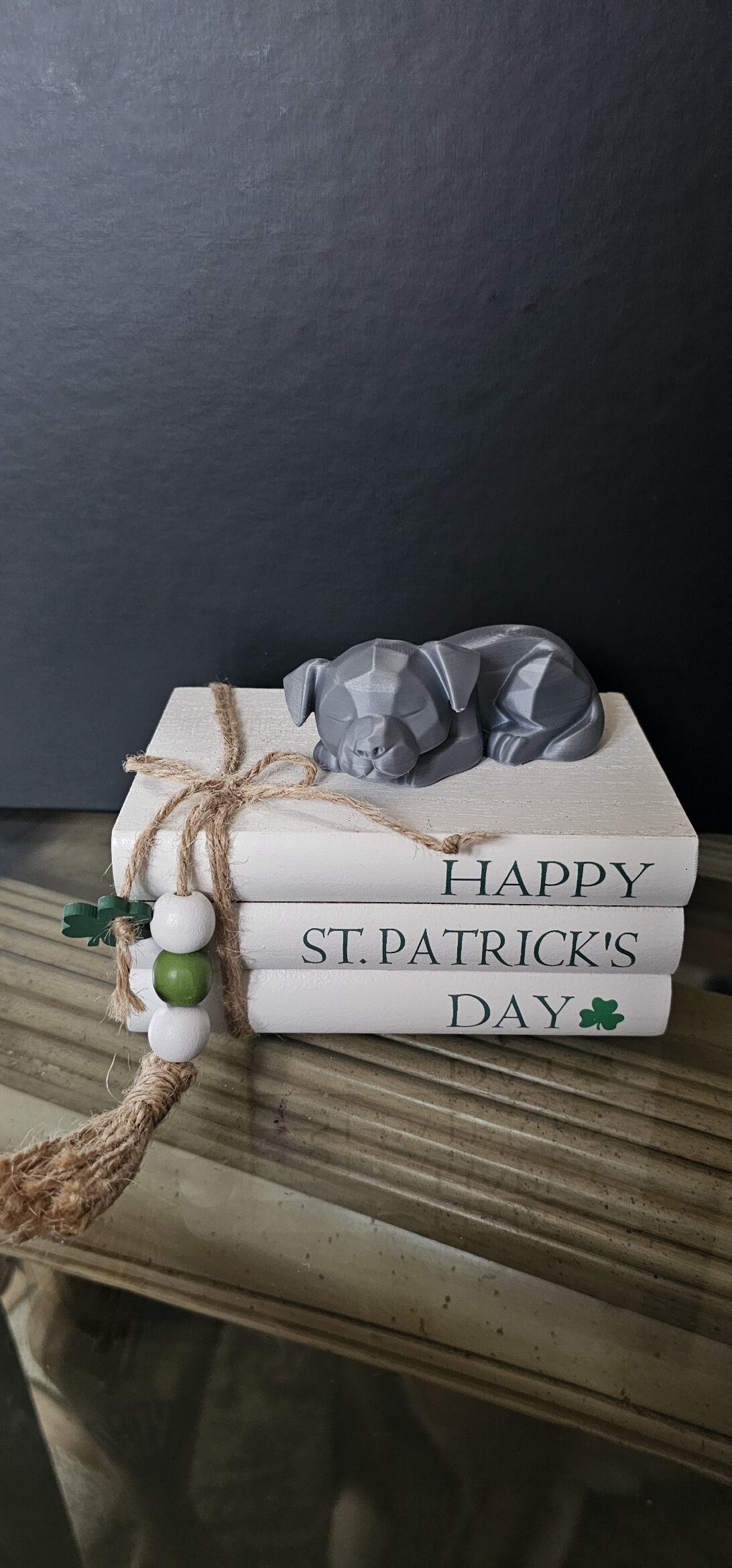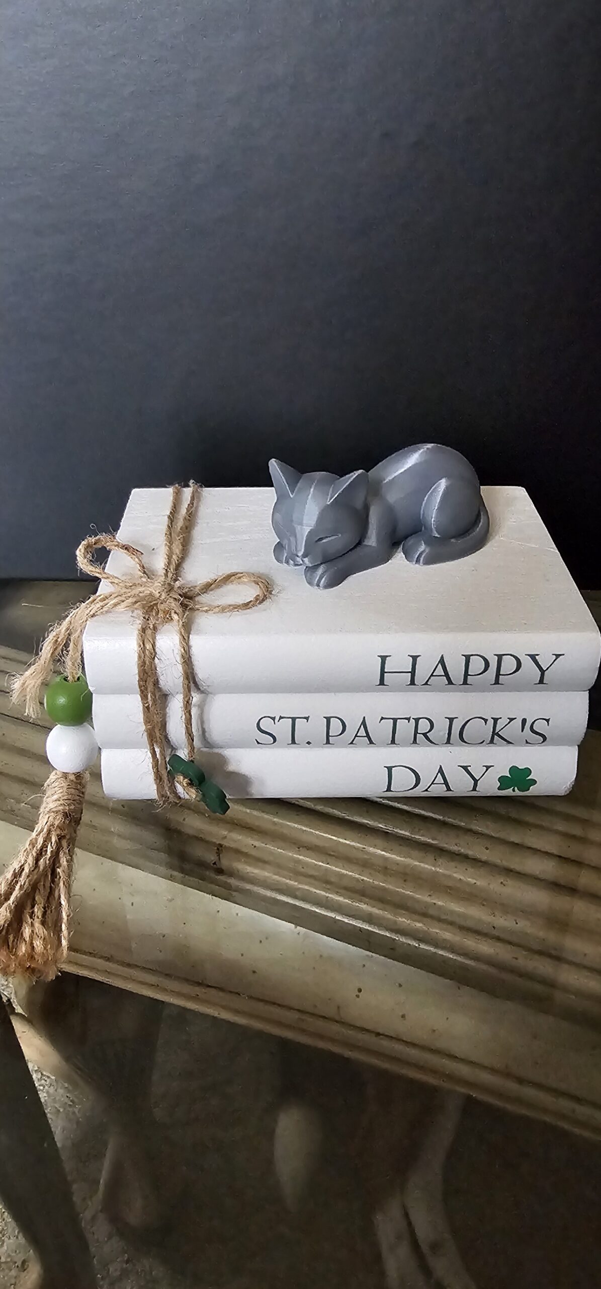 Add a playful touch to your St. Patrick’s Day decor with these charming cat and dog figurines, crafted from a unique blend of 3D-printed materials and wooden book stacks.